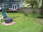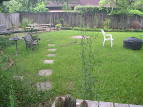 Today was the day to scalp some turf grass in preparation of my hoeing next month (or so), which I'll be doing instead of tilling. I dropped the mower and went at it. I went slowly to give grasshoppers a chance to hop away. Then I moved the stepping stones to what may or may not be their final locations. I just placed them on top of the ground without digging. I think I'll level a couple of them later on when I decide it's good.