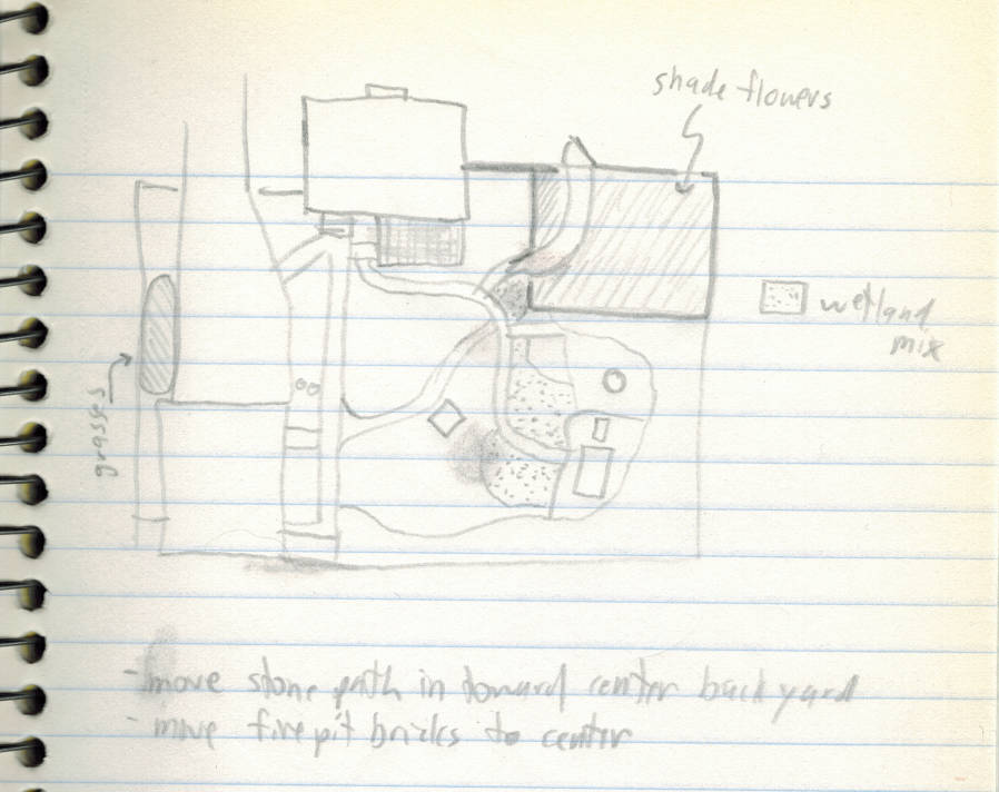 I want to move the deck-to-back-corner walkway, bringing it closer to the middle of the yard. I also want to create a new path that crosses the yard in the other direction from the garage to the chicken yard entrance. The firepit will be moved to this new path, taking it out of the shallow where the "wetland" area will be.