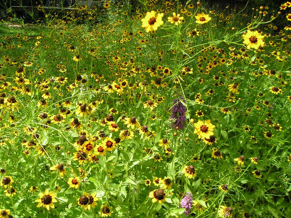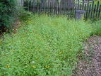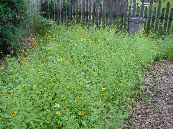 The rain garden is now fully covered with coreopsis. Some clasping coneflowers are coming in along with some horsemint. The tallest plants are roughly 5' tall. It's about time to finally cut the path to the back swing since it's pretty overgrown.