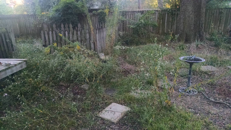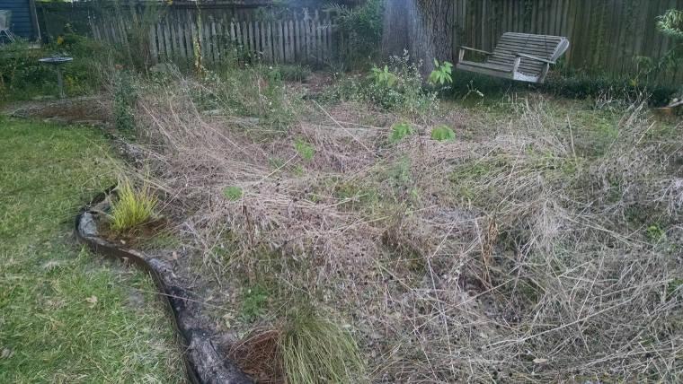 And finally there's the backyard rain garden, now full of dead annuals with some scattered, highly poisonous American nightshade. Yep, that there is not success. And that about wraps up this year's failures. Well, I didn't mention all the plants that withered and died: a couple sweet pepperbushes, coral honeysuckle, a scrub titi, a silverbell, and I can't remember what else. Yep, it's not been a killer year for natives around here.