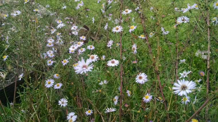 Ah, here are some lovely white asters. They grow all summer and finally bloom in October. Bees love them.