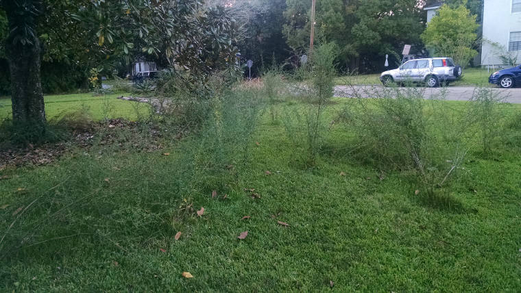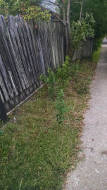 That picture is what it looks like farther toward the alley entrance. There's some mistake-looking common hackberry growing at left, a bunch of stuff in the middle surrounding Carolina buckthorn, and a large grove of male yaupon toward center-right. Virginia creeper is on the fence. I did start hoeing the grass a few weeks ago, but I haven't finished. I'm still not sure what to do here. Shrubs? Wildflowers and grasses from seed?