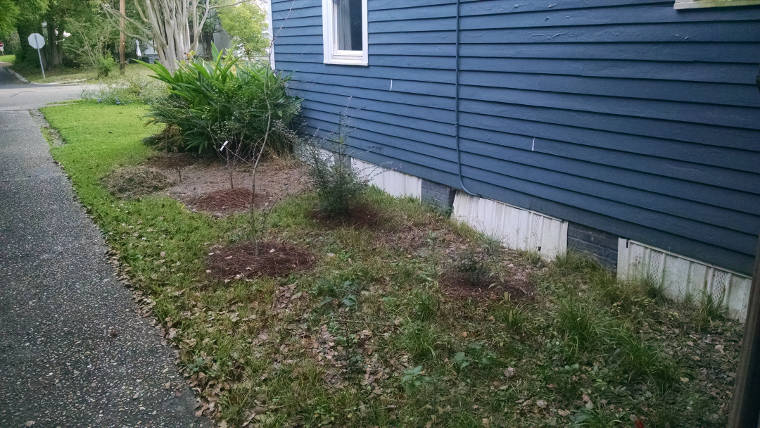 Back to the driveway is this mess. Some barren-looking parsley hawthorn and mayhaw. Closer to the wall is exotic loropetalum. The actual green stuff at the front of the house is exotic shell ginger.